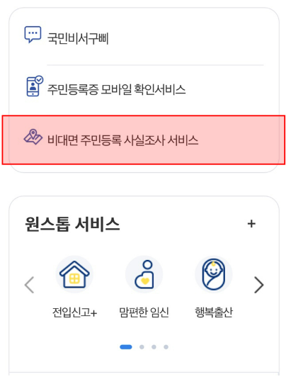정부 24 앱의 메인 화면에서 비대면 주민등록 사실조사 서비스 바로가기를 클릭해 주십시오.