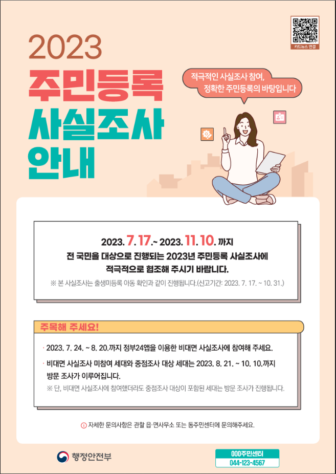 2023 주민등록 사실 조사에 대해서 알아보도록 하겠습니다. 전체 일정은 2023년 7월 17일부터 11월 10일까지이고